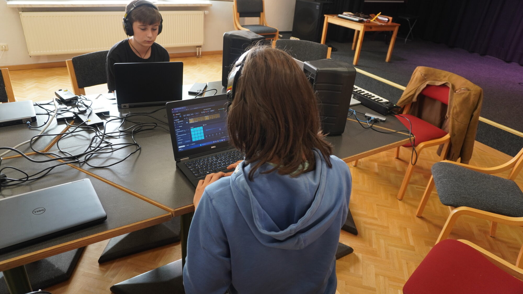 Each day combines warm-ups, group exploration and focused creative work phases, adapted to age group, energy and interests. Possible focus areas include rhythm, voice, rap, producing, ensemble work, movement, improvisation or simple instrument building. At the end of the week, students share the pieces, ideas or sound experiments they developed in a short and informal sharing or listening session.